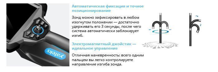 - Гибкость и точное позиционирование — запатентованная система электроприводного управления на 360° с максимальным изгибом до 220°, пошаговая регулировка скорости, функция автоматической блокировки и стабилизации зонда.