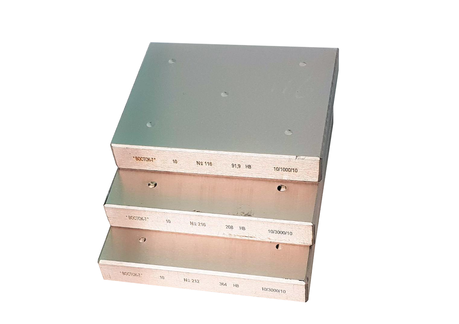 Эталонные меры твердости МТБ-Ч могут поставляться как поштучно, так и в виде комплектов, включающих в себя следующие пластины: