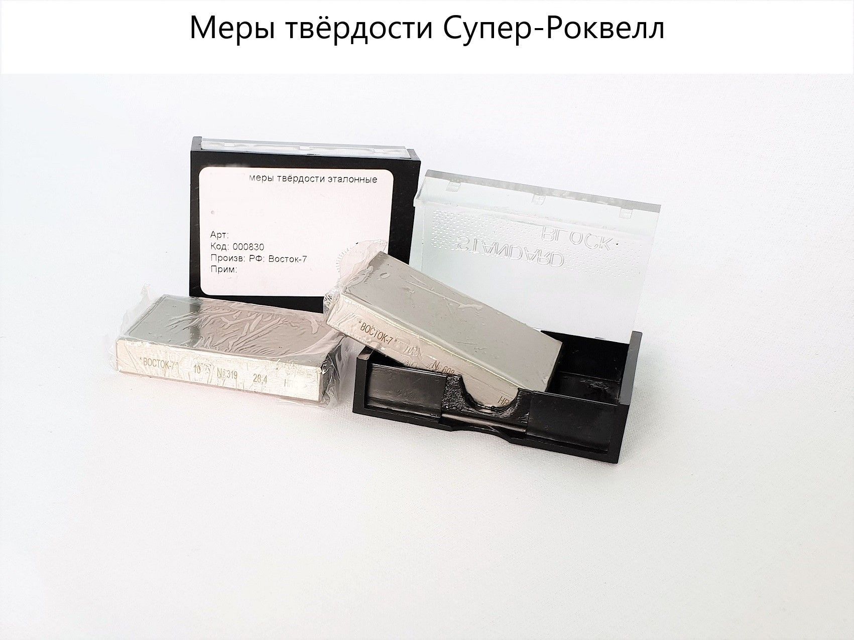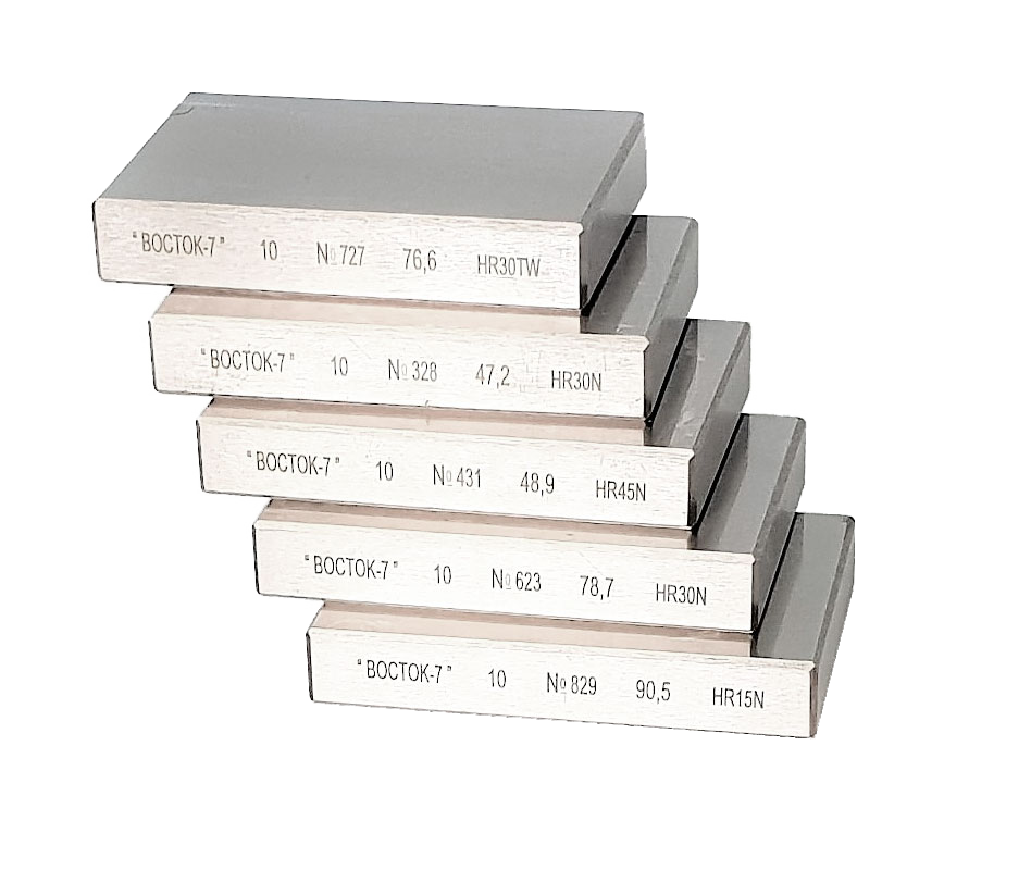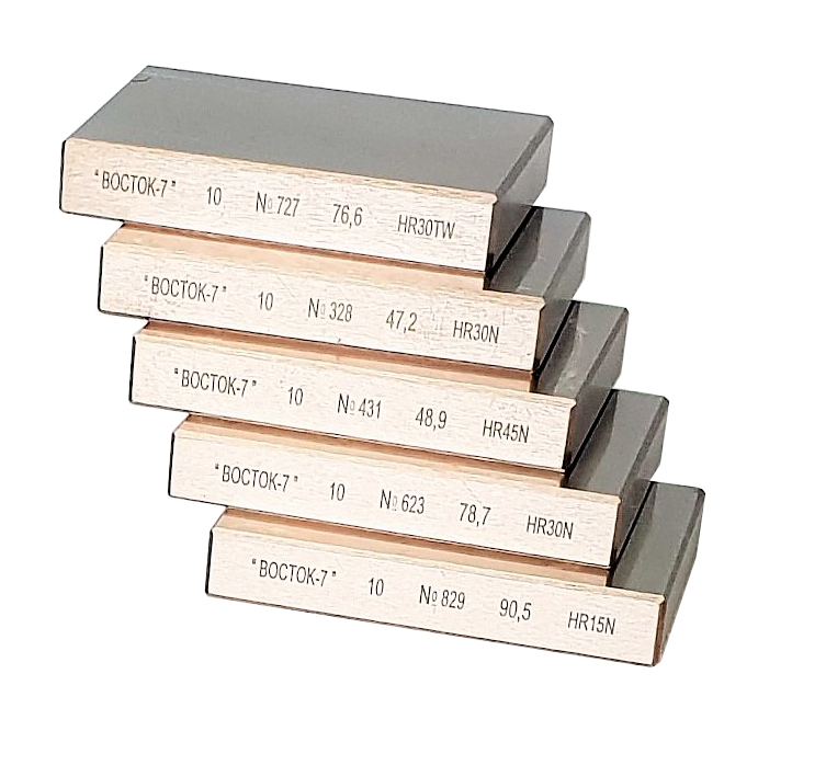 Изделия представляют собой прямоугольные плитки с одной рабочей стороной, предназначенные для поверки твердомеров по Супер-Роквеллу.