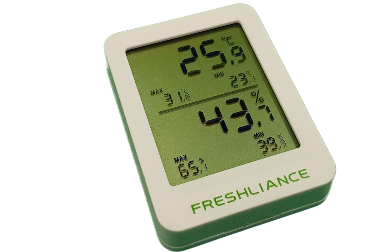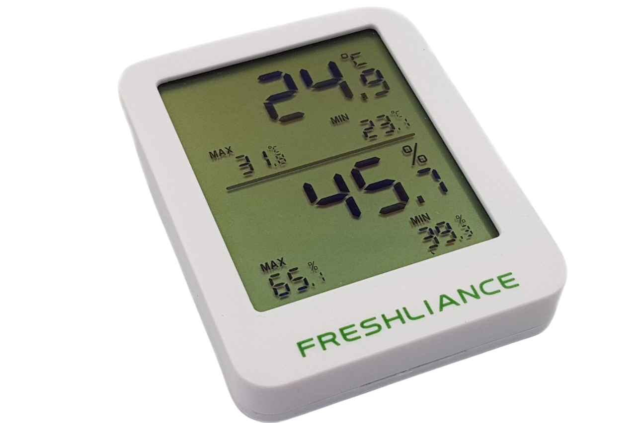 В прибор встроены датчики температуры и влажности, фиксирующие первичные данные. На передней панели находится яркий и контрастный LED-экран большого размера, на котором отображаются данные об окружающей среде и состоянии устройства.
