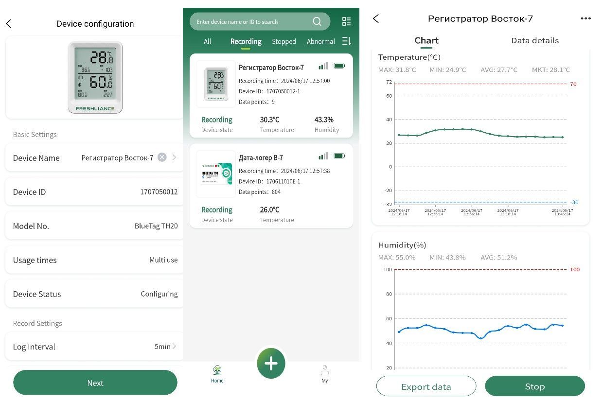 - С телефона или планшета оператор может в любой момент изменять настройки, изучать записанные данные, отправлять отчеты, мониторить температуру упаковки или контейнере, не вскрывая их.