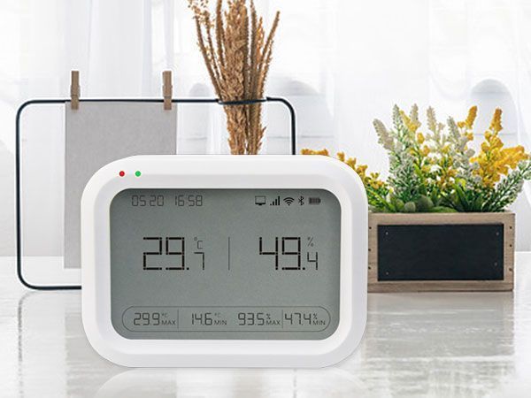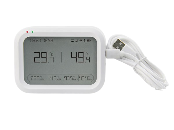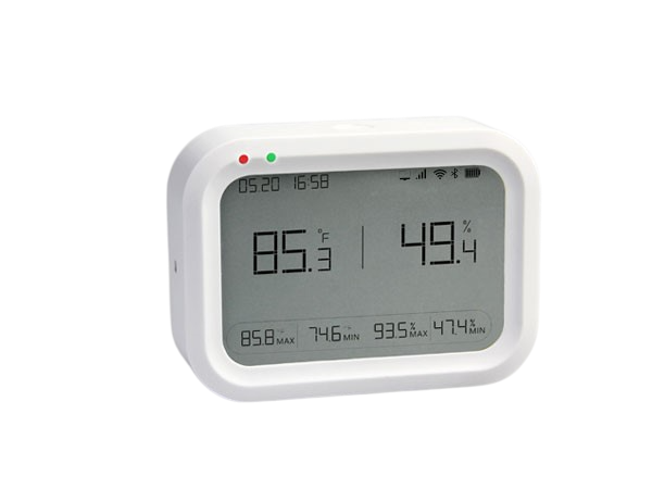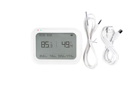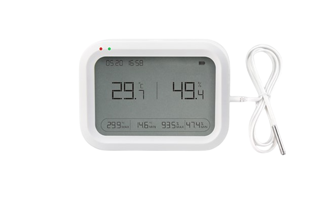На передней панели находится яркий и контрастный LED-экран большого размера, на котором отображаются данные об окружающей среде и состоянии устройства. Также имеются два световых индикатора красного и зеленого цветов, которые с помощью различных комбинаций обозначают начало и окончание работы, регистрацию параметров, задержку запуска и тревогу. О нарушении установленных порогов температуры прибор сообщает громким звуковым сигналом (более 70 децибел).