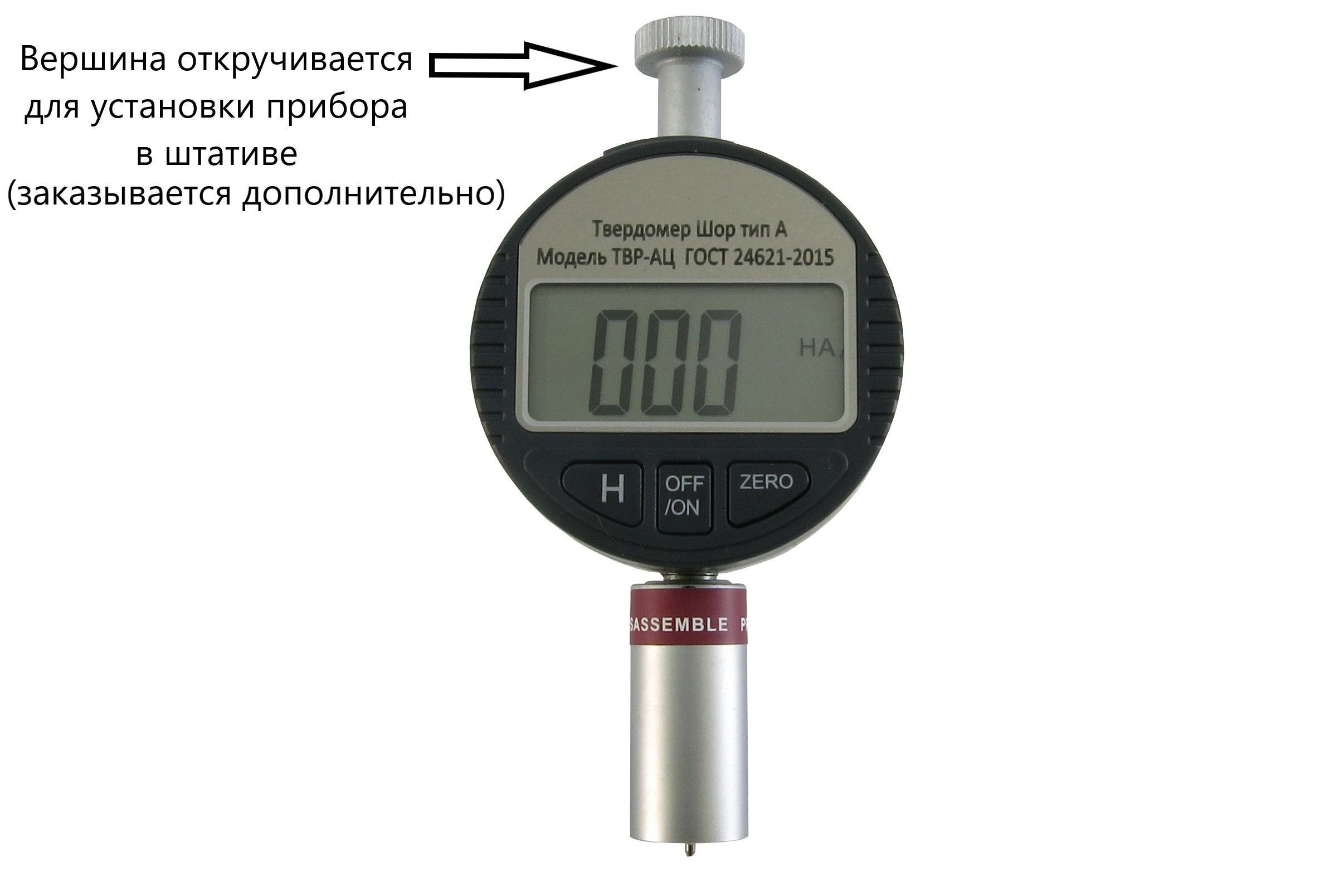 Дюрометр состоит из корпуса, внутри которого имеются механизмы измерения силы и деформации. Внизу корпуса находится ножка прибора, из которой выступает стальной индентор. Наверху корпуса имеется вершина – она используется для нажатия на прибор при работе в ручном режиме (модель ТВР-АЦ), а также для закрепления на штативе (модификация ТВР-АЦМ) для равномерной подачи нагрузки.